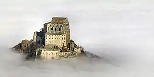 Saint-Michel de la Cluse, une des abbayes bénédictines les plus célèbres, figure aujourd'hui parmi les plus importants ensembles architecturaux de la période romane présents en Europe. La structure architecturale de l'abbaye est tout à fait particulière. Les masses rocheuses accidentées de la montagne se fondent avec l'ensemble constitué par le soubassement, les marches et les contreforts de soutènement pour former un seul corps[9].