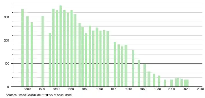 L'évolution du nombre d'habitants est connue à travers les recensements de la population effectués dans la commune depuis 1793. Pour les communes de moins de 10 000 habitants, une enquête de recensement portant sur toute la population est réalisée tous les cinq ans, les populations légales des années intermédiaires étant quant à elles estimées par interpolation ou extrapolation[17]. Pour la commune, le premier recensement exhaustif entrant dans le cadre du nouveau dispositif a été réalisé en 2008[18].