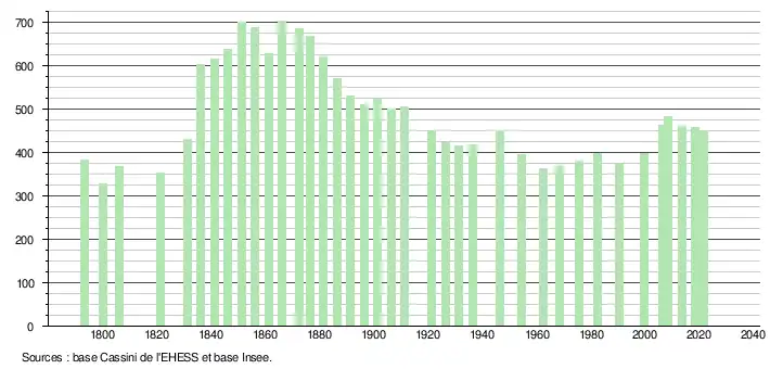 L'évolution du nombre d'habitants est connue à travers les recensements de la population effectués dans la commune depuis 1793. Pour les communes de moins de 10 000 habitants, une enquête de recensement portant sur toute la population est réalisée tous les cinq ans, les populations légales des années intermédiaires étant quant à elles estimées par interpolation ou extrapolation[59]. Pour la commune, le premier recensement exhaustif entrant dans le cadre du nouveau dispositif a été réalisé en 2008[60].