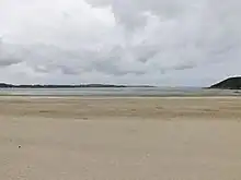 La plage de la « Lieue de Grève », longue de 4 km, occupe le fond d'une baie se découvrant sur près de 2 km à marée basse[27]