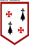 d'argent, à deux croisettes pattées de gueules rangées en bande et deux mouchetures d'hermine de sable rangées en barre, à la filière aussi de gueules.'