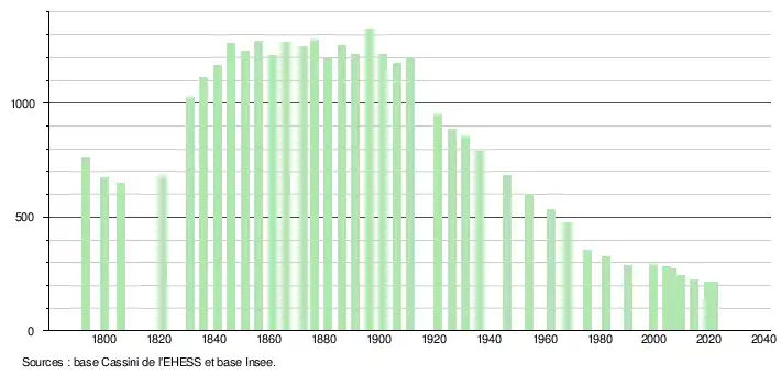 L'évolution du nombre d'habitants est connue à travers les recensements de la population effectués dans la commune depuis 1793. Pour les communes de moins de 10 000 habitants, une enquête de recensement portant sur toute la population est réalisée tous les cinq ans, les populations légales des années intermédiaires étant quant à elles estimées par interpolation ou extrapolation[21]. Pour la commune, le premier recensement exhaustif entrant dans le cadre du nouveau dispositif a été réalisé en 2004[22].