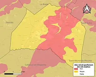 Le retrait-gonflement des sols argileux est susceptible d'engendrer des dommages importants aux bâtiments en cas d’alternance de périodes de sécheresse et de pluie. La totalité de la commune est en aléa moyen ou fort (67,4 % au niveau départemental et 48,5 % au niveau national). Sur les 667 bâtiments dénombrés sur la commune en 2019, 667 sont en aléa moyen ou fort, soit 100 %, à comparer aux 84 % au niveau départemental et 54 % au niveau national. Une cartographie de l'exposition du territoire national au retrait gonflement des sols argileux est disponible sur le site du BRGM[22],[Carte 2].