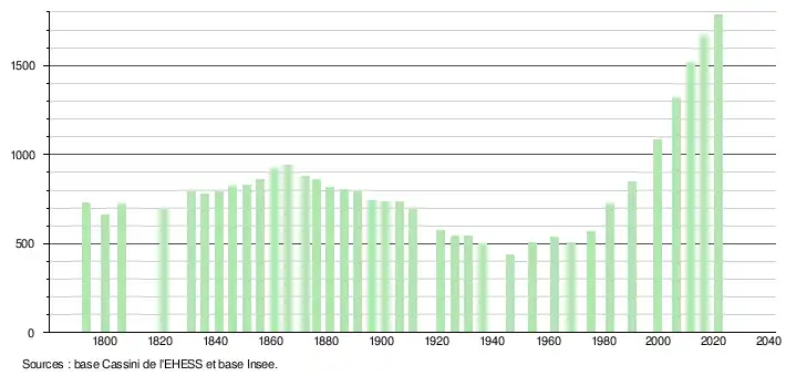 L'évolution du nombre d'habitants est connue à travers les recensements de la population effectués dans la commune depuis 1793. Pour les communes de moins de 10 000 habitants, une enquête de recensement portant sur toute la population est réalisée tous les cinq ans, les populations légales des années intermédiaires étant quant à elles estimées par interpolation ou extrapolation[34]. Pour la commune, le premier recensement exhaustif entrant dans le cadre du nouveau dispositif a été réalisé en 2006[35].