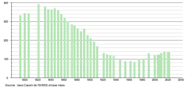 L'évolution du nombre d'habitants est connue à travers les recensements de la population effectués dans la commune depuis 1793. Pour les communes de moins de 10 000 habitants, une enquête de recensement portant sur toute la population est réalisée tous les cinq ans, les populations légales des années intermédiaires étant quant à elles estimées par interpolation ou extrapolation[15]. Pour la commune, le premier recensement exhaustif entrant dans le cadre du nouveau dispositif a été réalisé en 2004[16].