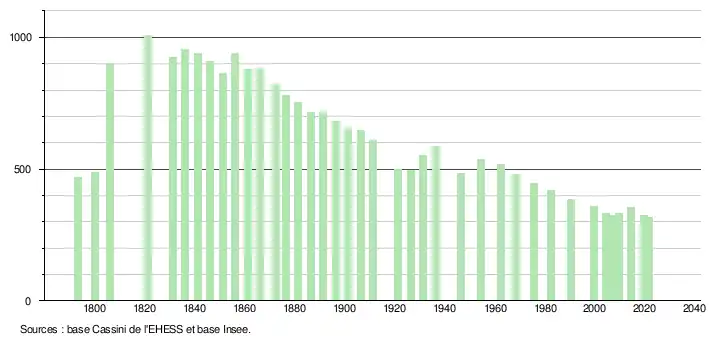 L'évolution du nombre d'habitants est connue à travers les recensements de la population effectués dans la commune depuis 1793. Pour les communes de moins de 10 000 habitants, une enquête de recensement portant sur toute la population est réalisée tous les cinq ans, les populations légales des années intermédiaires étant quant à elles estimées par interpolation ou extrapolation[27]. Pour la commune, le premier recensement exhaustif entrant dans le cadre du nouveau dispositif a été réalisé en 2004[28].