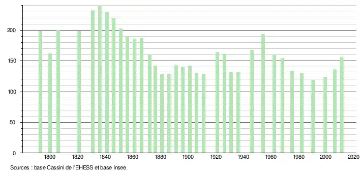 L'évolution du nombre d'habitants est connue à travers les recensements de la population effectués dans la commune depuis 1793. À partir du , les populations légales des communes sont publiées annuellement dans le cadre d'un recensement qui repose désormais sur une collecte d'information annuelle, concernant successivement tous les territoires communaux au cours d'une période de cinq ans. Pour les communes de moins de 10 000 habitants, une enquête de recensement portant sur toute la population est réalisée tous les cinq ans, les populations légales des années intermédiaires étant quant à elles estimées par interpolation ou extrapolation[5]. Pour la commune, le premier recensement exhaustif entrant dans le cadre du nouveau dispositif a été réalisé en 2006[6],[Note 1].