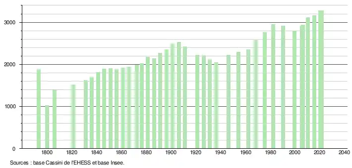 L'évolution du nombre d'habitants est connue à travers les recensements de la population effectués dans la commune depuis 1793. Pour les communes de moins de 10 000 habitants, une enquête de recensement portant sur toute la population est réalisée tous les cinq ans, les populations légales des années intermédiaires étant quant à elles estimées par interpolation ou extrapolation[27]. Pour la commune, le premier recensement exhaustif entrant dans le cadre du nouveau dispositif a été réalisé en 2005[28].