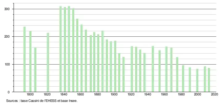 - Dans le tableau des recensements et le graphique, par convention dans Wikipédia, le principe a été retenu, pour les populations légales postérieures à 1999 de n’afficher dans le tableau des recensements et le graphique que les populations correspondant à l'année 2006, première population légale publiée calculée conformément aux concepts définis dans le décret no 2003-485 du 5 juin 2003, et les années correspondant à une enquête exhaustive de recensement pour les communes de moins de 10 000 habitants, ainsi que la dernière population légale publiée par l’Insee.