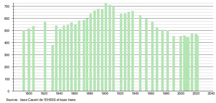 L'évolution du nombre d'habitants est connue à travers les recensements de la population effectués dans la commune depuis 1793. Pour les communes de moins de 10 000 habitants, une enquête de recensement portant sur toute la population est réalisée tous les cinq ans, les populations légales des années intermédiaires étant quant à elles estimées par interpolation ou extrapolation[18]. Pour la commune, le premier recensement exhaustif entrant dans le cadre du nouveau dispositif a été réalisé en 2004[19].