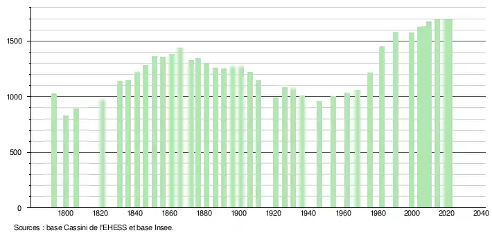 L'évolution du nombre d'habitants est connue à travers les recensements de la population effectués dans la commune depuis 1793. Pour les communes de moins de 10 000 habitants, une enquête de recensement portant sur toute la population est réalisée tous les cinq ans, les populations légales des années intermédiaires étant quant à elles estimées par interpolation ou extrapolation[17]. Pour la commune, le premier recensement exhaustif entrant dans le cadre du nouveau dispositif a été réalisé en 2004[18].