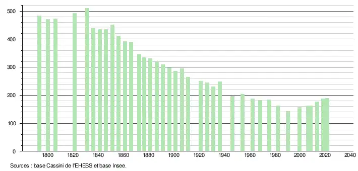 L'évolution du nombre d'habitants est connue à travers les recensements de la population effectués dans la commune depuis 1793. Pour les communes de moins de 10 000 habitants, une enquête de recensement portant sur toute la population est réalisée tous les cinq ans, les populations légales des années intermédiaires étant quant à elles estimées par interpolation ou extrapolation[20]. Pour la commune, le premier recensement exhaustif entrant dans le cadre du nouveau dispositif a été réalisé en 2008[21].