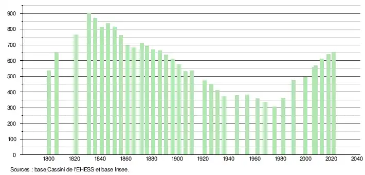 L'évolution du nombre d'habitants est connue à travers les recensements de la population effectués dans la commune depuis 1800. Pour les communes de moins de 10 000 habitants, une enquête de recensement portant sur toute la population est réalisée tous les cinq ans, les populations légales des années intermédiaires étant quant à elles estimées par interpolation ou extrapolation[25]. Pour la commune, le premier recensement exhaustif entrant dans le cadre du nouveau dispositif a été réalisé en 2007[26].