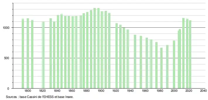 L'évolution du nombre d'habitants est connue à travers les recensements de la population effectués dans la commune depuis 1793. Pour les communes de moins de 10 000 habitants, une enquête de recensement portant sur toute la population est réalisée tous les cinq ans, les populations légales des années intermédiaires étant quant à elles estimées par interpolation ou extrapolation[21]. Pour la commune, le premier recensement exhaustif entrant dans le cadre du nouveau dispositif a été réalisé en 2007[22].