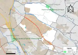 L’inventaire des zones naturelles d'intérêt écologique, faunistique et floristique (ZNIEFF) a pour objectif de réaliser une couverture des zones les plus intéressantes sur le plan écologique, essentiellement dans la perspective d’améliorer la connaissance du patrimoine naturel national et de fournir aux différents décideurs un outil d’aide à la prise en compte de l’environnement dans l’aménagement du territoire. Une ZNIEFF de type 1[Note 2] est recensée sur la commune[20] : les « prairies humides des bords de la Saune » (47 ha), couvrant 5 communes du département[21].