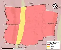 Le retrait-gonflement des sols argileux est susceptible d'engendrer des dommages importants aux bâtiments en cas d’alternance de périodes de sécheresse et de pluie. La totalité de la commune est en aléa moyen ou fort (94,5 % au niveau départemental et 48,5 % au niveau national). Sur les 52 bâtiments dénombrés sur la commune en 2019, 52 sont en aléa moyen ou fort, soit 100 %, à comparer aux 93 % au niveau départemental et 54 % au niveau national. Une cartographie de l'exposition du territoire national au retrait gonflement des sols argileux est disponible sur le site du BRGM[20],[Carte 3].