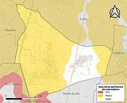 Le retrait-gonflement des sols argileux est susceptible d'engendrer des dommages importants aux bâtiments en cas d’alternance de périodes de sécheresse et de pluie. 78,2 % de la superficie communale est en aléa moyen ou fort (54,2 % au niveau départemental et 48,5 % au niveau national). Sur les 666 bâtiments dénombrés sur la commune en 2019, 596 sont en aléa moyen ou fort, soit 89 %, à comparer aux 57 % au niveau départemental et 54 % au niveau national. Une cartographie de l'exposition du territoire national au retrait gonflement des sols argileux est disponible sur le site du BRGM[12],[Carte 2].