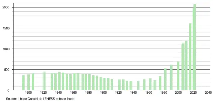 L'évolution du nombre d'habitants est connue à travers les recensements de la population effectués dans la commune depuis 1793. Pour les communes de moins de 10 000 habitants, une enquête de recensement portant sur toute la population est réalisée tous les cinq ans, les populations légales des années intermédiaires étant quant à elles estimées par interpolation ou extrapolation[18]. Pour la commune, le premier recensement exhaustif entrant dans le cadre du nouveau dispositif a été réalisé en 2005[19].
