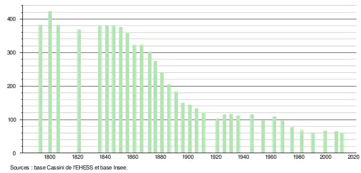 L'évolution du nombre d'habitants est connue à travers les recensements de la population effectués dans la commune depuis 1793. À partir du , les populations légales des communes sont publiées annuellement dans le cadre d'un recensement qui repose désormais sur une collecte d'information annuelle, concernant successivement tous les territoires communaux au cours d'une période de cinq ans. Pour les communes de moins de 10 000 habitants, une enquête de recensement portant sur toute la population est réalisée tous les cinq ans, les populations légales des années intermédiaires étant quant à elles estimées par interpolation ou extrapolation[9]. Pour la commune, le premier recensement exhaustif entrant dans le cadre du nouveau dispositif a été réalisé en 2007[10],[Note 2].