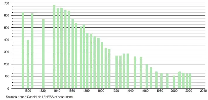 L'évolution du nombre d'habitants est connue à travers les recensements de la population effectués dans la commune depuis 1793. Pour les communes de moins de 10 000 habitants, une enquête de recensement portant sur toute la population est réalisée tous les cinq ans, les populations légales des années intermédiaires étant quant à elles estimées par interpolation ou extrapolation[22]. Pour la commune, le premier recensement exhaustif entrant dans le cadre du nouveau dispositif a été réalisé en 2007[23].