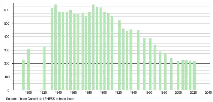 L'évolution du nombre d'habitants est connue à travers les recensements de la population effectués dans la commune depuis 1793. Pour les communes de moins de 10 000 habitants, une enquête de recensement portant sur toute la population est réalisée tous les cinq ans, les populations légales des années intermédiaires étant quant à elles estimées par interpolation ou extrapolation[24]. Pour la commune, le premier recensement exhaustif entrant dans le cadre du nouveau dispositif a été réalisé en 2005[25].
