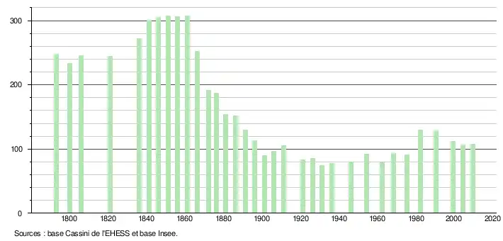 - Dans le tableau des recensements et le graphique, par convention dans Wikipédia, le principe a été retenu, pour les populations légales postérieures à 1999 de n’afficher dans le tableau des recensements et le graphique que les populations correspondant à l'année 2006, première population légale publiée calculée conformément aux concepts définis dans le décret no 2003-485 du 5 juin 2003, et les années correspondant à une enquête exhaustive de recensement pour les communes de moins de 10 000 habitants, ainsi que la dernière population légale publiée par l’Insee.