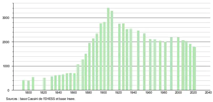 L'évolution du nombre d'habitants est connue à travers les recensements de la population effectués dans la commune depuis 1793. Pour les communes de moins de 10 000 habitants, une enquête de recensement portant sur toute la population est réalisée tous les cinq ans, les populations légales des années intermédiaires étant quant à elles estimées par interpolation ou extrapolation[27]. Pour la commune, le premier recensement exhaustif entrant dans le cadre du nouveau dispositif a été réalisé en 2005[28].
