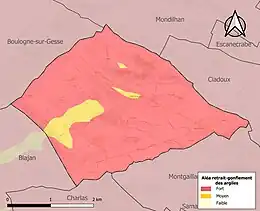Le retrait-gonflement des sols argileux est susceptible d'engendrer des dommages importants aux bâtiments en cas d’alternance de périodes de sécheresse et de pluie. La totalité de la commune est en aléa moyen ou fort (88,8 % au niveau départemental et 48,5 % au niveau national). Sur les 68 bâtiments dénombrés sur la commune en 2019, 68 sont en aléa moyen ou fort, soit 100 %, à comparer aux 98 % au niveau départemental et 54 % au niveau national. Une cartographie de l'exposition du territoire national au retrait gonflement des sols argileux est disponible sur le site du BRGM[24],[Carte 3].