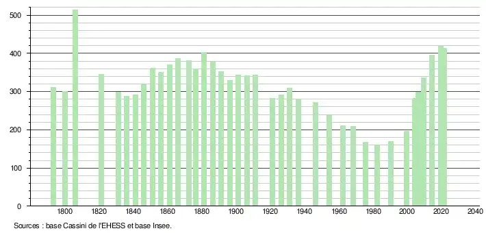 L'évolution du nombre d'habitants est connue à travers les recensements de la population effectués dans la commune depuis 1793. Pour les communes de moins de 10 000 habitants, une enquête de recensement portant sur toute la population est réalisée tous les cinq ans, les populations légales des années intermédiaires étant quant à elles estimées par interpolation ou extrapolation[16]. Pour la commune, le premier recensement exhaustif entrant dans le cadre du nouveau dispositif a été réalisé en 2004[17].