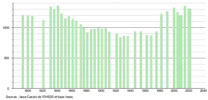 L'évolution du nombre d'habitants est connue à travers les recensements de la population effectués dans la commune depuis 1793. Pour les communes de moins de 10 000 habitants, une enquête de recensement portant sur toute la population est réalisée tous les cinq ans, les populations légales des années intermédiaires étant quant à elles estimées par interpolation ou extrapolation[23]. Pour la commune, le premier recensement exhaustif entrant dans le cadre du nouveau dispositif a été réalisé en 2004[24].