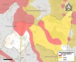 Le retrait-gonflement des sols argileux est susceptible d'engendrer des dommages importants aux bâtiments en cas d’alternance de périodes de sécheresse et de pluie. 76,1 % de la superficie communale est en aléa moyen ou fort (54,2 % au niveau départemental et 48,5 % au niveau national). Sur les 147 bâtiments dénombrés sur la commune en 2019, 114 sont en aléa moyen ou fort, soit 78 %, à comparer aux 57 % au niveau départemental et 54 % au niveau national. Une cartographie de l'exposition du territoire national au retrait gonflement des sols argileux est disponible sur le site du BRGM[14],[Carte 2].