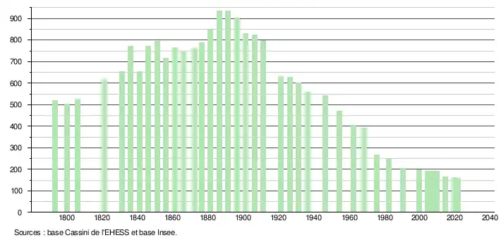 L'évolution du nombre d'habitants est connue à travers les recensements de la population effectués dans la commune depuis 1793. Pour les communes de moins de 10 000 habitants, une enquête de recensement portant sur toute la population est réalisée tous les cinq ans, les populations légales des années intermédiaires étant quant à elles estimées par interpolation ou extrapolation[15]. Pour la commune, le premier recensement exhaustif entrant dans le cadre du nouveau dispositif a été réalisé en 2004[16].