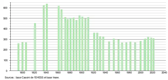 L'évolution du nombre d'habitants est connue à travers les recensements de la population effectués dans la commune depuis 1793. Pour les communes de moins de 10 000 habitants, une enquête de recensement portant sur toute la population est réalisée tous les cinq ans, les populations légales des années intermédiaires étant quant à elles estimées par interpolation ou extrapolation[16]. Pour la commune, le premier recensement exhaustif entrant dans le cadre du nouveau dispositif a été réalisé en 2007[17].