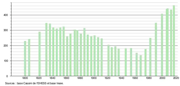 L'évolution du nombre d'habitants est connue à travers les recensements de la population effectués dans la commune depuis 1800. Pour les communes de moins de 10 000 habitants, une enquête de recensement portant sur toute la population est réalisée tous les cinq ans, les populations légales des années intermédiaires étant quant à elles estimées par interpolation ou extrapolation[4]. Pour la commune, le premier recensement exhaustif entrant dans le cadre du nouveau dispositif a été réalisé en 2007[5].