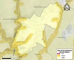 Le retrait-gonflement des sols argileux est susceptible d'engendrer des dommages importants aux bâtiments en cas d’alternance de périodes de sécheresse et de pluie. 23,8 % de la superficie communale est en aléa moyen ou fort (26,8 % au niveau départemental et 48,5 % au niveau national). Sur les 75 bâtiments dénombrés sur la commune en 2019, aucun n'est en aléa moyen ou fort, à comparer aux 36 % au niveau départemental et 54 % au niveau national. Une cartographie de l'exposition du territoire national au retrait gonflement des sols argileux est disponible sur le site du BRGM[16],[Carte 2].