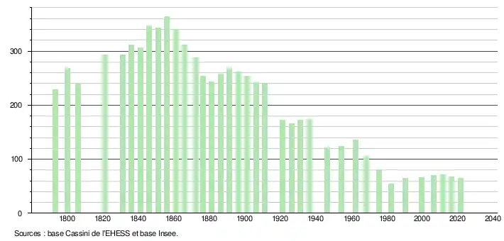 L'évolution du nombre d'habitants est connue à travers les recensements de la population effectués dans la commune depuis 1793. Pour les communes de moins de 10 000 habitants, une enquête de recensement portant sur toute la population est réalisée tous les cinq ans, les populations légales des années intermédiaires étant quant à elles estimées par interpolation ou extrapolation[22]. Pour la commune, le premier recensement exhaustif entrant dans le cadre du nouveau dispositif a été réalisé en 2006[23].