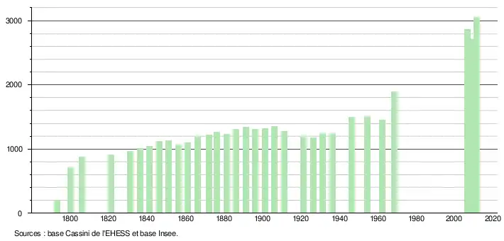 L'évolution du nombre d'habitants est connue à travers les recensements de la population effectués dans la commune depuis 1793. Pour les communes de moins de 10 000 habitants, une enquête de recensement portant sur toute la population est réalisée tous les cinq ans, les populations légales des années intermédiaires étant quant à elles estimées par interpolation ou extrapolation[7]. Pour la commune, le premier recensement exhaustif entrant dans le cadre du nouveau dispositif a été réalisé en 2004[8].