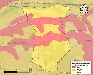 Le retrait-gonflement des sols argileux est susceptible d'engendrer des dommages importants aux bâtiments en cas d’alternance de périodes de sécheresse et de pluie. La totalité de la commune est en aléa moyen ou fort (67,4 % au niveau départemental et 48,5 % au niveau national). Sur les 251 bâtiments dénombrés sur la commune en 2019, 251 sont en aléa moyen ou fort, soit 100 %, à comparer aux 84 % au niveau départemental et 54 % au niveau national. Une cartographie de l'exposition du territoire national au retrait gonflement des sols argileux est disponible sur le site du BRGM[22],[Carte 2].