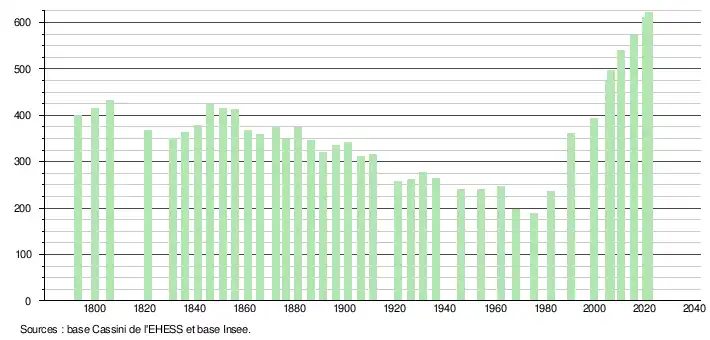 L'évolution du nombre d'habitants est connue à travers les recensements de la population effectués dans la commune depuis 1793. Pour les communes de moins de 10 000 habitants, une enquête de recensement portant sur toute la population est réalisée tous les cinq ans, les populations légales des années intermédiaires étant quant à elles estimées par interpolation ou extrapolation[30]. Pour la commune, le premier recensement exhaustif entrant dans le cadre du nouveau dispositif a été réalisé en 2005[31].