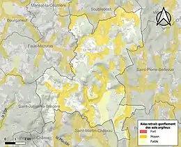 Le retrait-gonflement des sols argileux est susceptible d'engendrer des dommages importants aux bâtiments en cas d’alternance de périodes de sécheresse et de pluie. 31,8 % de la superficie communale est en aléa moyen ou fort (33,6 % au niveau départemental et 48,5 % au niveau national). Sur les 243 bâtiments dénombrés sur la commune en 2019, 56 sont en aléa moyen ou fort, soit 23 %, à comparer aux 25 % au niveau départemental et 54 % au niveau national. Une cartographie de l'exposition du territoire national au retrait gonflement des sols argileux est disponible sur le site du BRGM[17],[Carte 2].