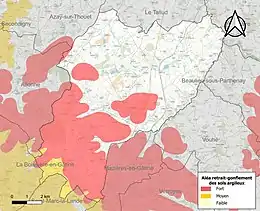 Les mouvements de terrains susceptibles de se produire sur la commune sont des affaissements et effondrements liés aux cavités souterraines (hors mines) et des tassements différentiels[22]. Afin de mieux appréhender le risque d’affaissement de terrain, un inventaire national permet de localiser les éventuelles cavités souterraines sur la commune[23]. Le retrait-gonflement des sols argileux est susceptible d'engendrer des dommages importants aux bâtiments en cas d’alternance de périodes de sécheresse et de pluie[24]. 38,1 % de la superficie communale est en aléa moyen ou fort (54,9 % au niveau départemental et 48,5 % au niveau national)[25]. Depuis le , en application de la loi ELAN, différentes contraintes s'imposent aux vendeurs, maîtres d'ouvrages ou constructeurs de biens situés dans une zone classée en aléa moyen ou fort[Note 8],[26].