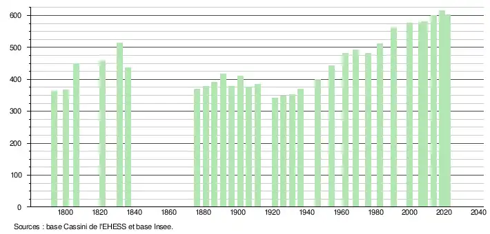 | L'évolution du nombre d'habitants est connue à travers les recensements de la population effectués dans la commune depuis 1793. Pour les communes de moins de 10 000 habitants, une enquête de recensement portant sur toute la population est réalisée tous les cinq ans, les populations légales des années intermédiaires étant quant à elles estimées par interpolation ou extrapolation[29]. Pour la commune, le premier recensement exhaustif entrant dans le cadre du nouveau dispositif a été réalisé en 2008[30]. En 2021, la commune comptait 603 habitants[Note 6], en diminution de 0,5 % par rapport à 2015 (Lot-et-Garonne : −0,66 %, France hors Mayotte : +1,84 %). |