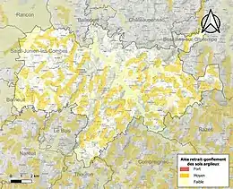 Le retrait-gonflement des sols argileux est susceptible d'engendrer des dommages importants aux bâtiments en cas d’alternance de périodes de sécheresse et de pluie[16]. 32,8 % de la superficie communale est en aléa moyen ou fort (27 % au niveau départemental et 48,5 % au niveau national métropolitain)[17]. Depuis le , en application de la loi ÉLAN, différentes contraintes s'imposent aux vendeurs, maîtres d'ouvrages ou constructeurs de biens situés dans une zone classée en aléa moyen ou fort[Note 3],[18].
