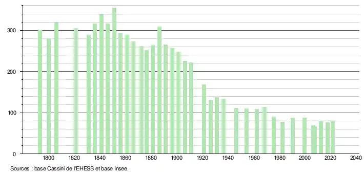 | L'évolution du nombre d'habitants est connue à travers les recensements de la population effectués dans la commune depuis 1793. Pour les communes de moins de 10 000 habitants, une enquête de recensement portant sur toute la population est réalisée tous les cinq ans, les populations légales des années intermédiaires étant quant à elles estimées par interpolation ou extrapolation[23]. Pour la commune, le premier recensement exhaustif entrant dans le cadre du nouveau dispositif a été réalisé en 2007[24]. En 2021, la commune comptait 79 habitants[Note 4], en stagnation par rapport à 2015 (Corrèze : −0,86 %, France hors Mayotte : +1,84 %). |