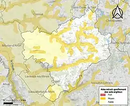 Le retrait-gonflement des sols argileux est susceptible d'engendrer des dommages importants aux bâtiments en cas d’alternance de périodes de sécheresse et de pluie. 27,5 % de la superficie communale est en aléa moyen ou fort (33,6 % au niveau départemental et 48,5 % au niveau national). Sur les 274 bâtiments dénombrés sur la commune en 2019, 93 sont en aléa moyen ou fort, soit 34 %, à comparer aux 25 % au niveau départemental et 54 % au niveau national. Une cartographie de l'exposition du territoire national au retrait gonflement des sols argileux est disponible sur le site du BRGM[16],[Carte 2].