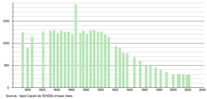 L'évolution du nombre d'habitants est connue à travers les recensements de la population effectués dans la commune depuis 1793. Pour les communes de moins de 10 000 habitants, une enquête de recensement portant sur toute la population est réalisée tous les cinq ans, les populations légales des années intermédiaires étant quant à elles estimées par interpolation ou extrapolation[21]. Pour la commune, le premier recensement exhaustif entrant dans le cadre du nouveau dispositif a été réalisé en 2008[22].