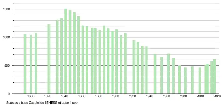 L'évolution du nombre d'habitants est connue à travers les recensements de la population effectués dans la commune depuis 1793. Pour les communes de moins de 10 000 habitants, une enquête de recensement portant sur toute la population est réalisée tous les cinq ans, les populations légales des années intermédiaires étant quant à elles estimées par interpolation ou extrapolation[3]. Pour la commune, le premier recensement exhaustif entrant dans le cadre du nouveau dispositif a été réalisé en 2008[4].