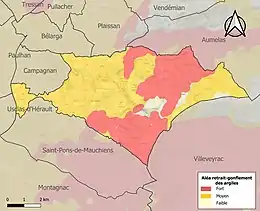 Le retrait-gonflement des sols argileux est susceptible d'engendrer des dommages importants aux bâtiments en cas d’alternance de périodes de sécheresse et de pluie. 95,9 % de la superficie communale est en aléa moyen ou fort (59,3 % au niveau départemental et 48,5 % au niveau national). Sur les 1 066 bâtiments dénombrés sur la commune en 2019, 1 066 sont en aléa moyen ou fort, soit 100 %, à comparer aux 85 % au niveau départemental et 54 % au niveau national. Une cartographie de l'exposition du territoire national au retrait gonflement des sols argileux est disponible sur le site du BRGM[24],[Carte 2].
