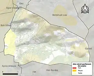 Le retrait-gonflement des sols argileux est susceptible d'engendrer des dommages importants aux bâtiments en cas d’alternance de périodes de sécheresse et de pluie. La totalité de la commune est en aléa faible (44,5 % au niveau départemental et 48,5 % au niveau national). Sur les 106 bâtiments dénombrés sur la commune en 2019, aucun n'est en aléa moyen ou fort, à comparer aux 75 % au niveau départemental et 54 % au niveau national. Une cartographie de l'exposition du territoire national au retrait gonflement des sols argileux est disponible sur le site du BRGM[32],[Carte 3].