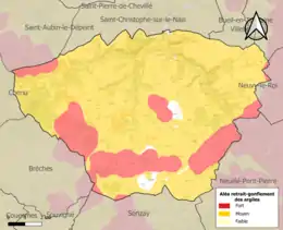 La commune est vulnérable au risque de mouvements de terrains constitué principalement du retrait-gonflement des sols argileux[33]. Cet aléa est susceptible d'engendrer des dommages importants aux bâtiments en cas d’alternance de périodes de sécheresse et de pluie. 98,2 % de la superficie communale est en aléa moyen ou fort (90,2 % au niveau départemental et 48,5 % au niveau national). Sur les 891 bâtiments dénombrés sur la commune en 2019, 868 sont en aléa moyen ou fort, soit 97 %, à comparer aux 91 % au niveau départemental et 54 % au niveau national. Une cartographie de l'exposition du territoire national au retrait gonflement des sols argileux est disponible sur le site du BRGM[34],[35].